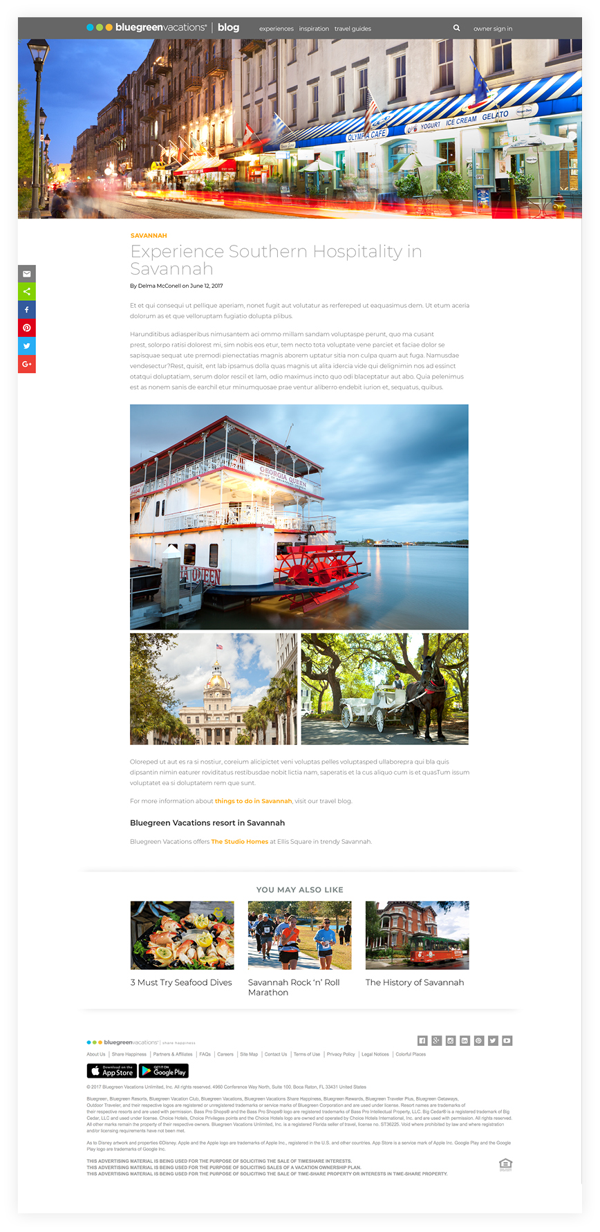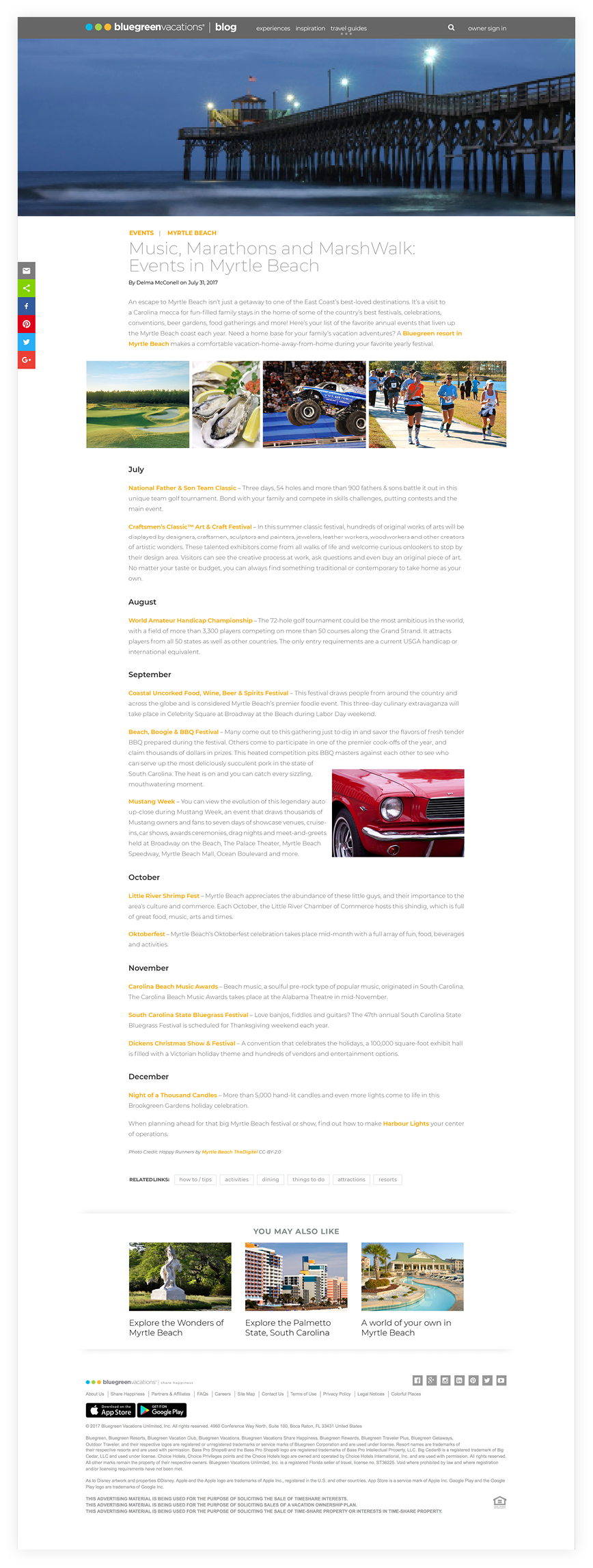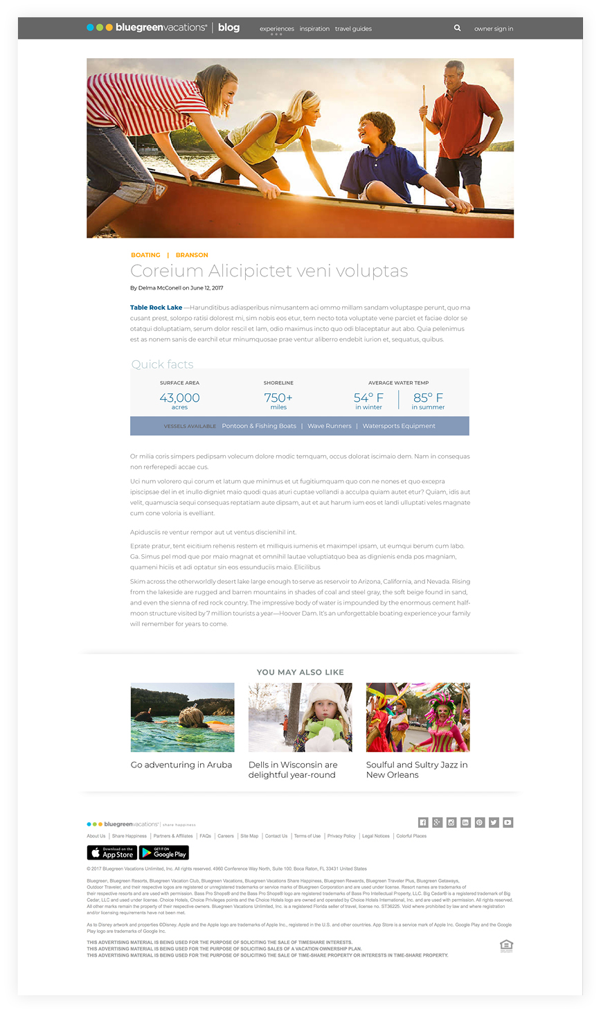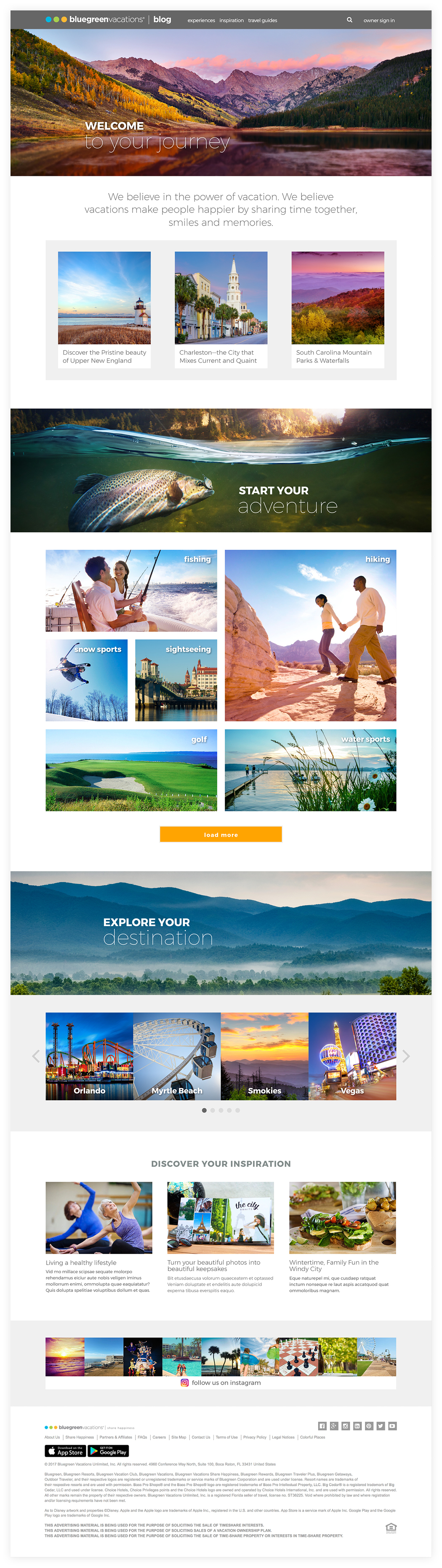 The Bluegreen Vacations Travel Blog was designed to deliver keyword-rich story content that would appeal to potential customers. The site features timely stories with rich photography and a layout that complements multiple viewports and browsing devices. The project involved coordinating with multiple areas including marketing, editorial, programming, and sales to achieve the desired effect.