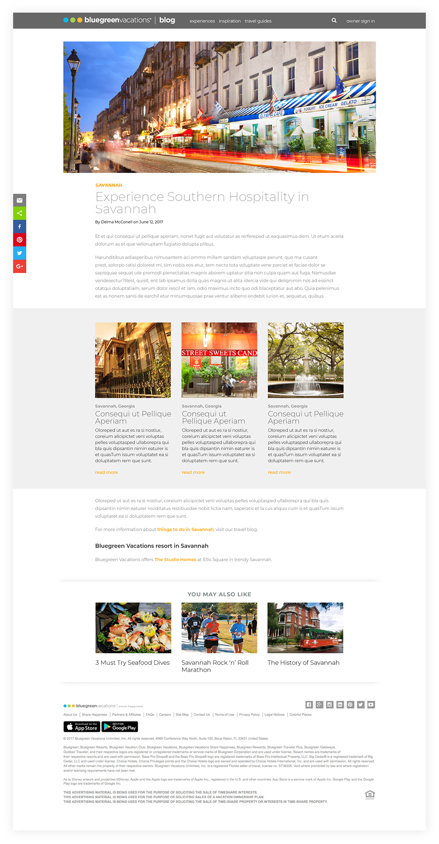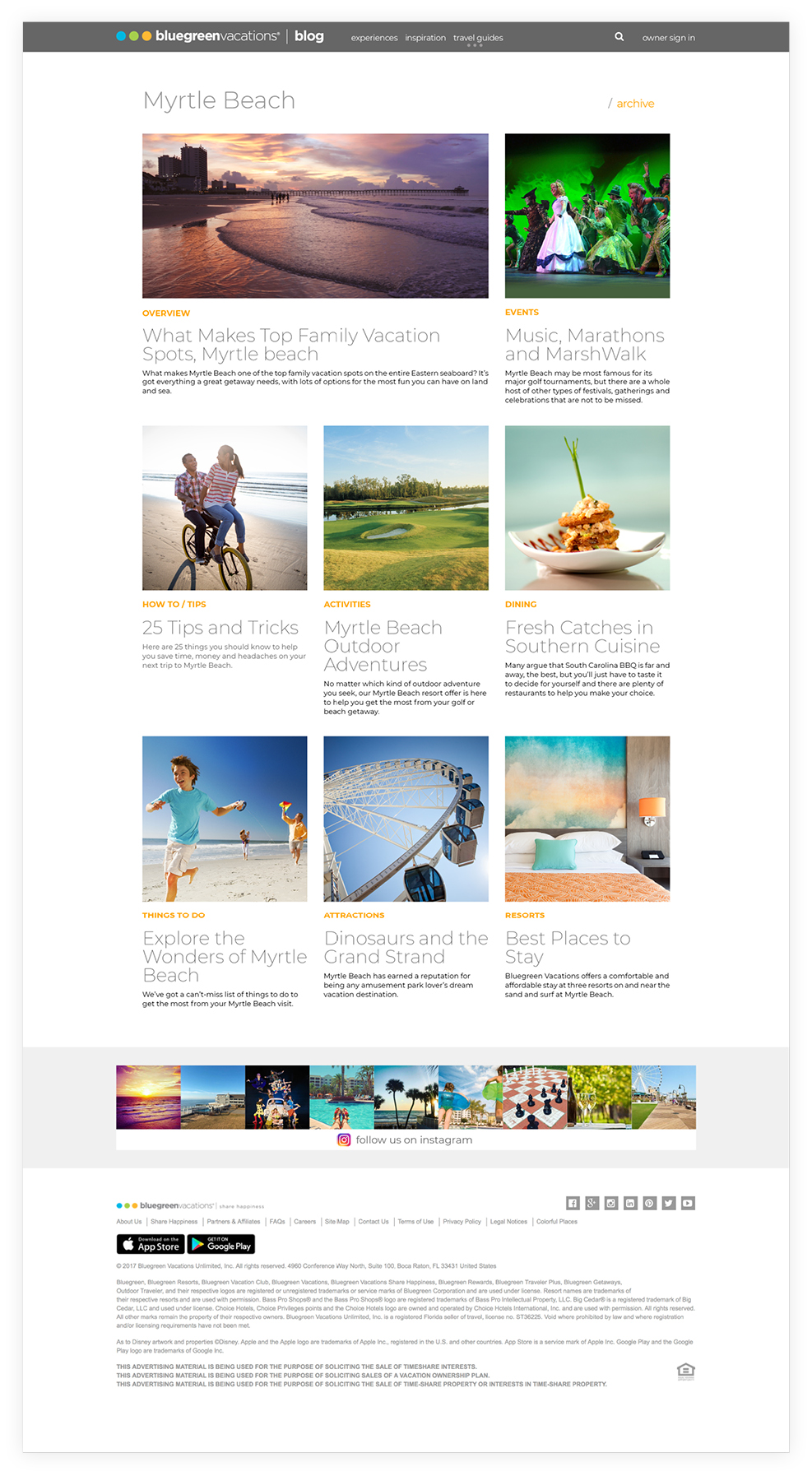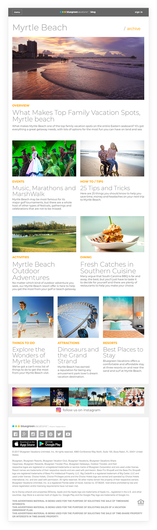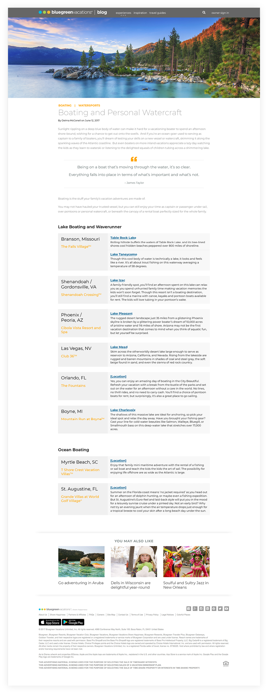 The Bluegreen Vacations Travel Blog was designed to deliver keyword-rich story content that would appeal to potential customers. The site features timely stories with rich photography and a layout that complements multiple viewports and browsing devices. The project involved coordinating with multiple areas including marketing, editorial, programming, and sales to achieve the desired effect.