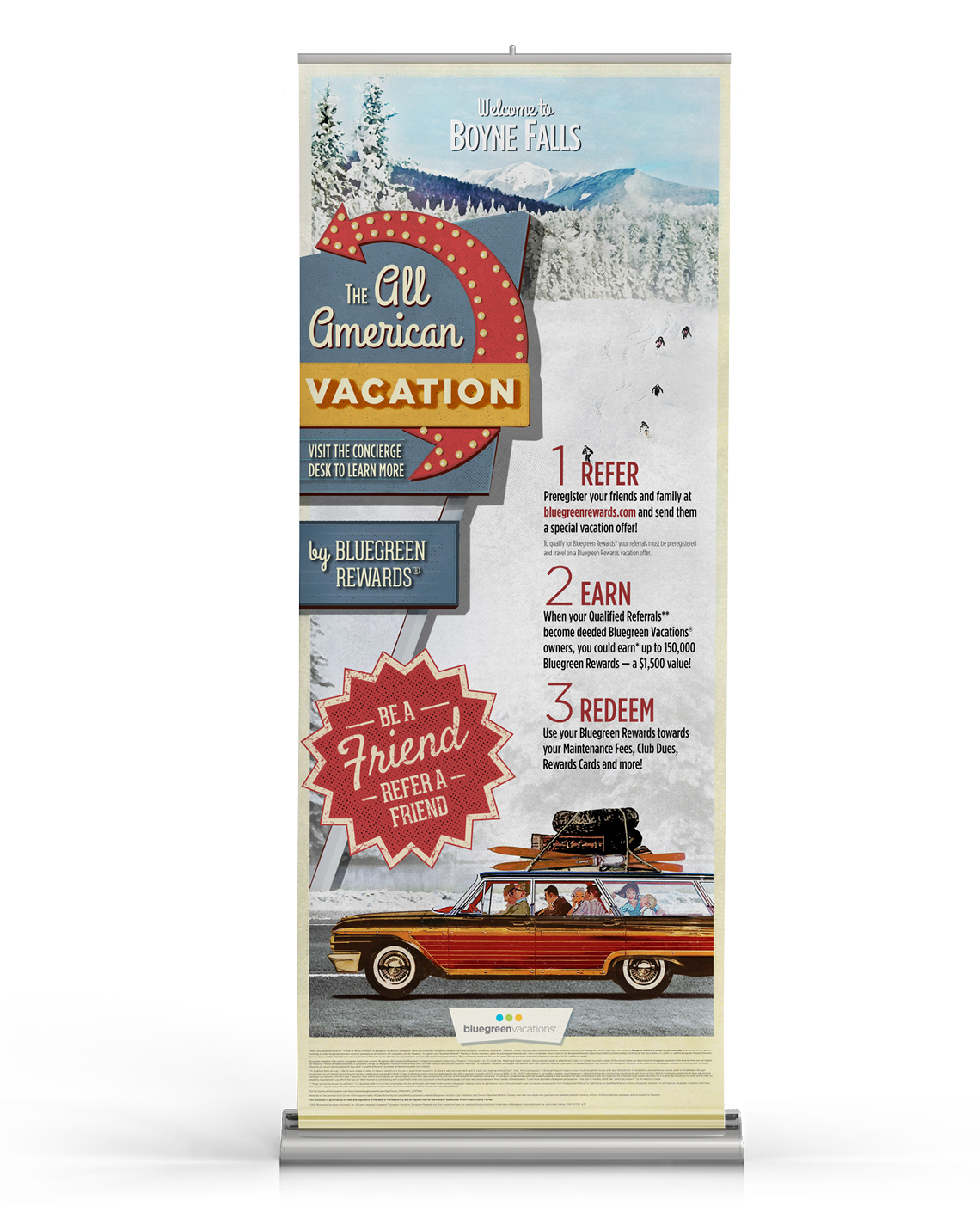 Pull up banners are used at kiosks during Bluegreen Vacations customer and membership drive events. The "All-American Vacation" series was inspired by the classic American family vacation. The banners matched collateral and other materials sent during the campaign.