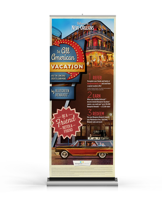 A series of 19 destination pull up banners are used at kiosks during Bluegreen Vacations customer and membership drive events. The "All-American Vacation" series was inspired by the classic American family vacation. The banners matched collateral and other materials sent during the campaign.